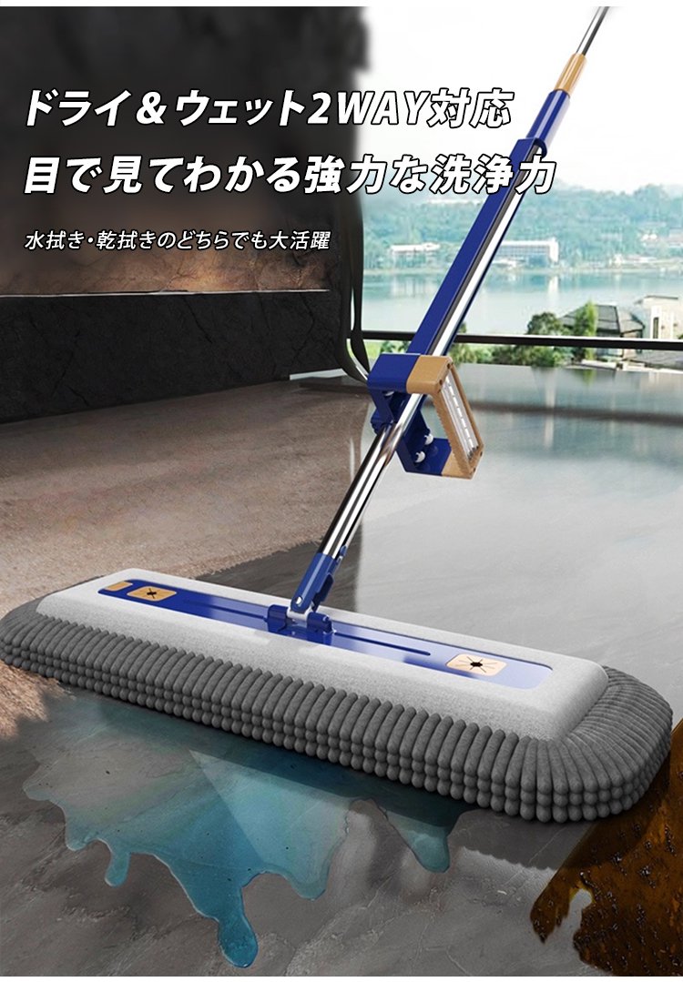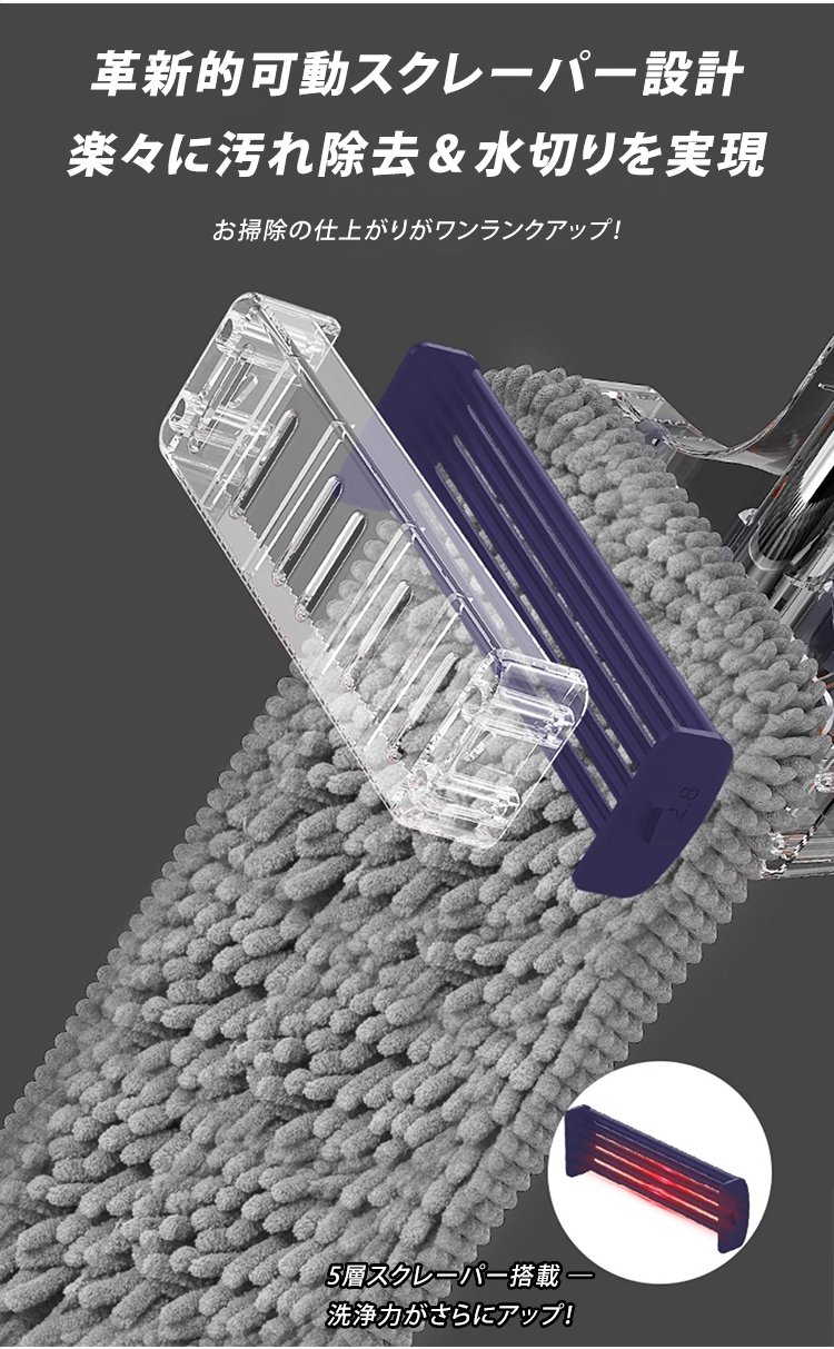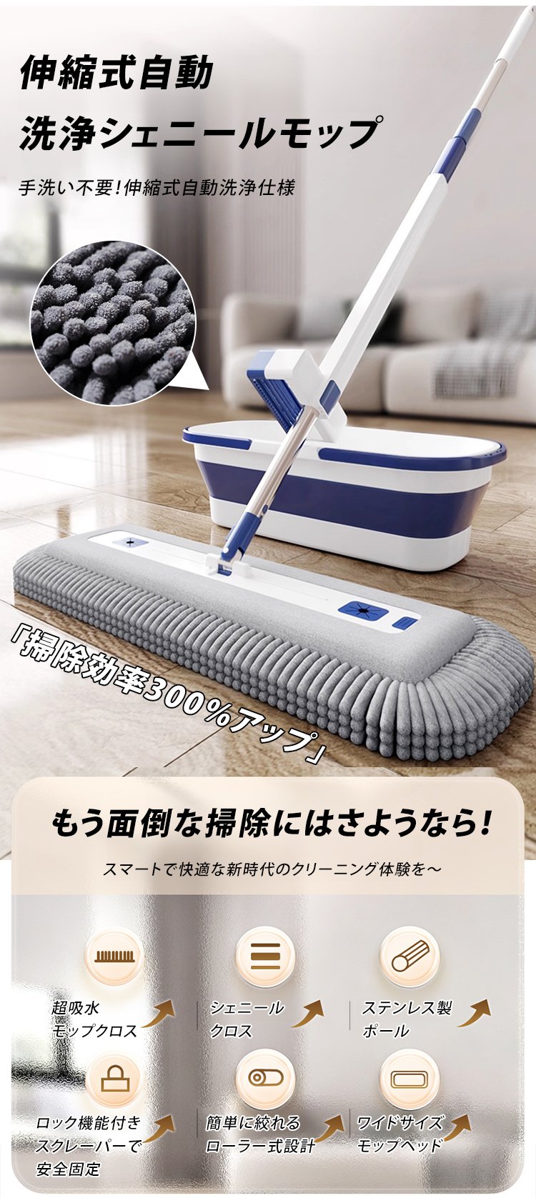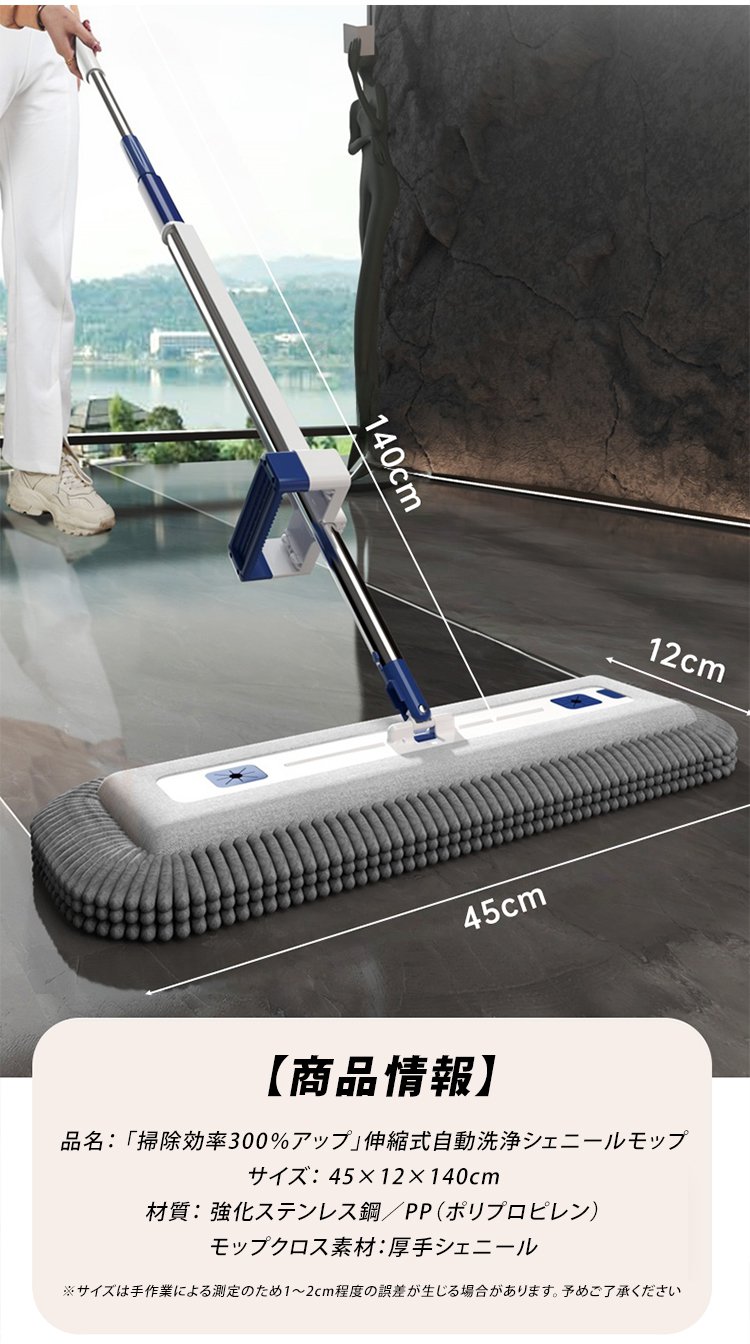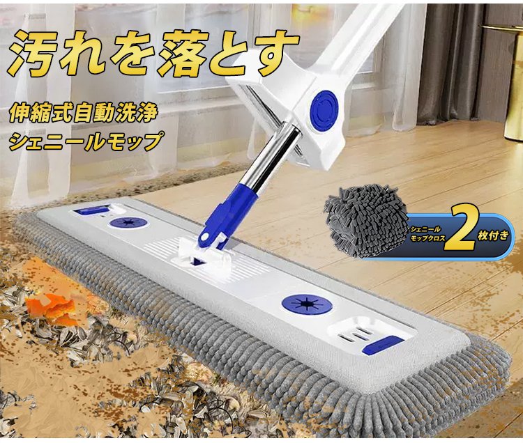 「掃除効率300%アップ」伸縮式自動洗浄シェニールモップ